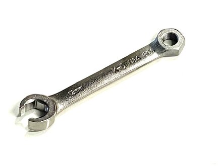 Getting that oil pressure line off the bottom of the oil filter housing on the 1977 to 1985 240D, 300D, 300TD, 300CD, and W116 300SD is tough. If you break the line or damage the nut, this part is no longer available new. A crowfoot wrench is the safest way, and a custom short one like this will allow you to get on it from under the car. This line must be removed when changing the housing gaskets ( which are very prone to leaking). Note the nut welded at the other end of the wrench. This provides a good grip as well as a method to get extra torque. Stick a phillips screw or punch into the hole and up against the steering box to "pry" on the wrench to break the line nut loose.
