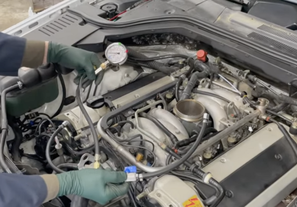 Doing a fuel pressure test is easy on the M119 engine. The pressure regulator is located on the left back end of the rail near the firewall.