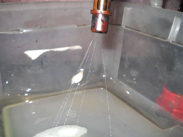 If your engine idles roughly, quits after startup, smokes, and/or delivers poor fuel economy, it may be time to replace the injectors. Spray timing and pattern are critical to top engine performance. They must be spraying with a full and fine mist. Take a look at the images below of injectors I recently tested from a 300E.