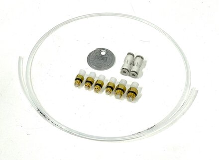 This kit includes four smaller end fittings that attach the lines to the struts and valve blocks, two larger fittings used on the later all plastic valve blocks between the block and the compressor, 1 meter of 4mm high-pressure line, two splice connectors (if you have to replace a broken or cracked plastic high-pressure line), and one gapping tool to modify the locking ring if the nylone line can not be pushed in. Be sure to watch the on-demand video so you fully understand the modification process. These are "push-on to lock" in place. The fittings can replace ones that have been broken or are leaking air. You can use the line to splice in a damaged or leaking pressure line.