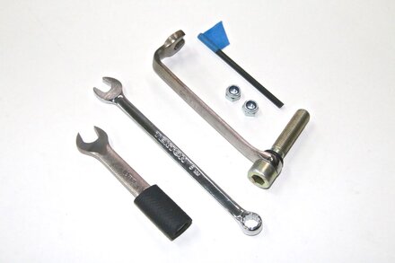 This custom tools set is designed by Kent and manufacured in his shop. You have one thin head and short 10 mm open end wrench and one curved head 10 mm open end with a bolt going through the box end of the wrench. The purpose of the bolt is to give you extra torque when twisting the head of the wrench. PLEASE NOTE: as of March 24, 2016 we have added a modified 8 mm wrench to work with the new rods available and raised the price of the tool set accordingly.
