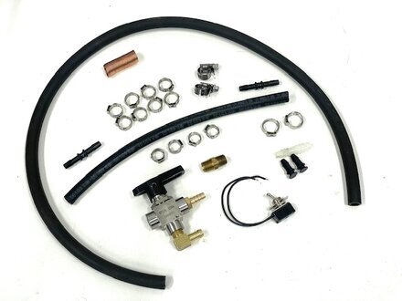 You will receive the hoses, fittings, clamps, electrical switch, and a three-way valve as shown below. The switch will run your new fuel pump in the trunk and the valve will allow you to switch between tanks.